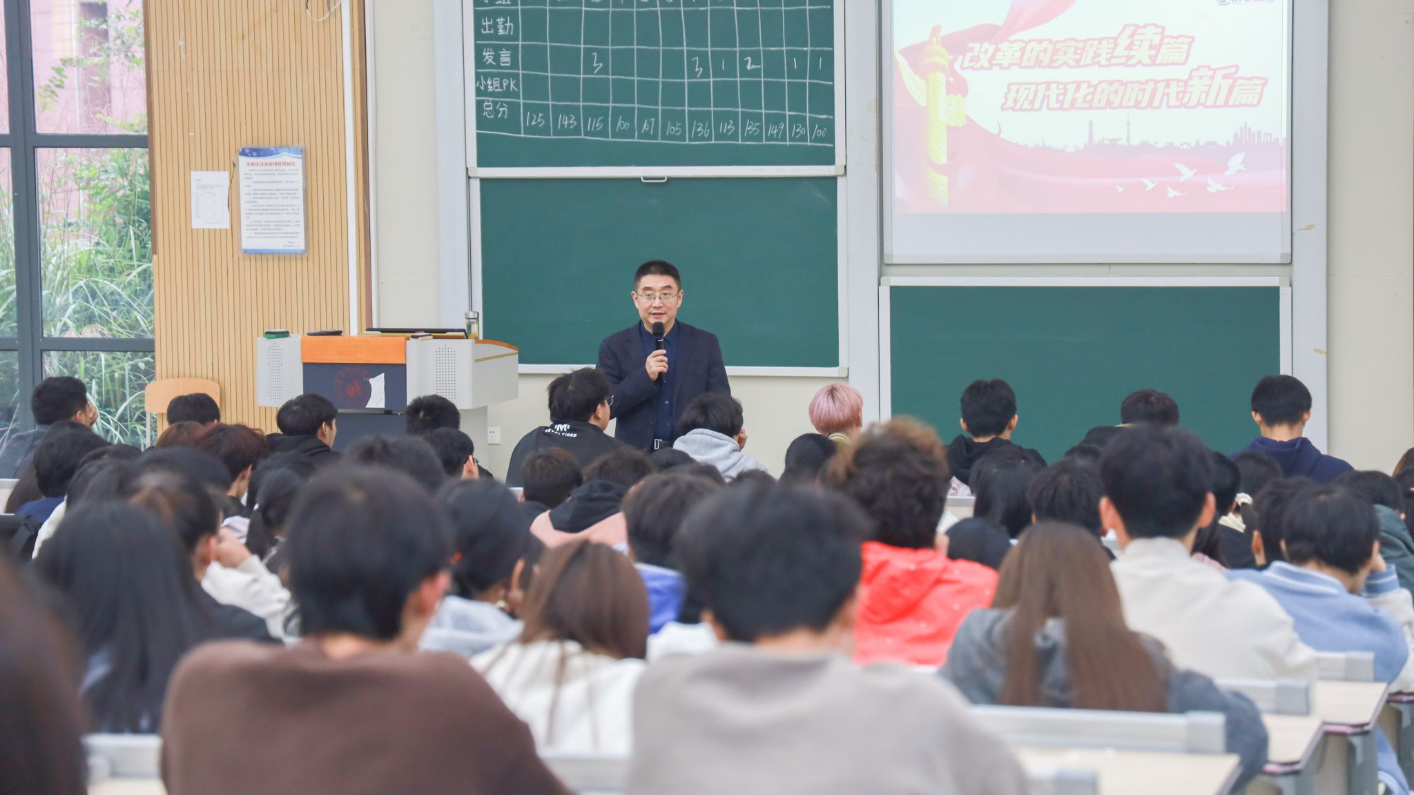 本网讯(文/施宣 图/王亿) 11月4日下午,副校长张鹏在执治楼112教室讲授题为《改革的实践续篇 现代化的时代新篇》的思政课,24级数学(1)班、(2)班、(3)班,24级植科班学生到场聆听。